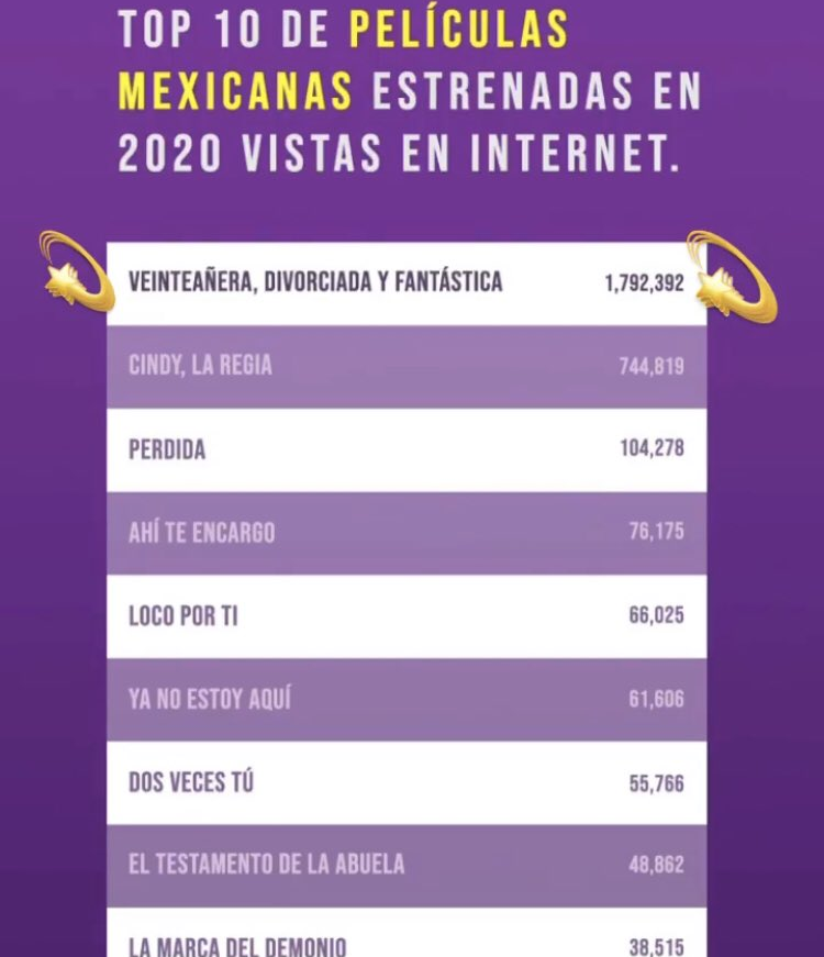 Veinteanera divorciada y fantastica estrelado por Paulina Goto lançado no ano passado foi o filme mais visto pela Internet la no México lembrando que ele acabou sendo prejudicado já que o mesmo teve sua estreia uma semana antes do país entra em quarentena